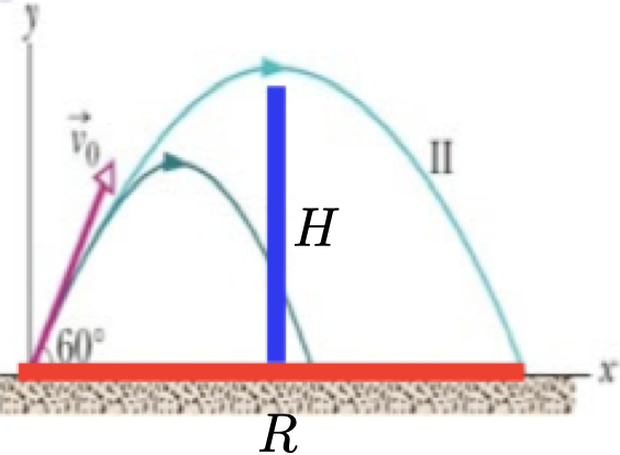 Alcance horizontal máximo (\(H = 0, \theta = 45^o\)).