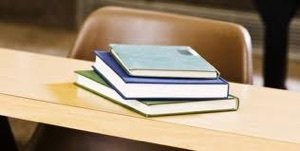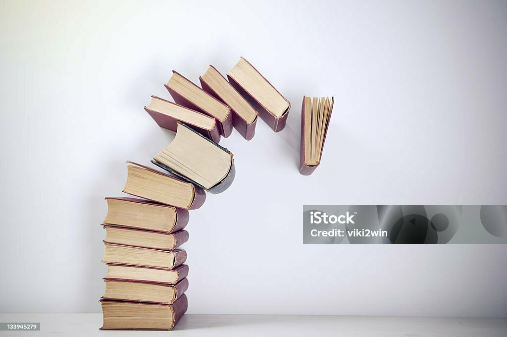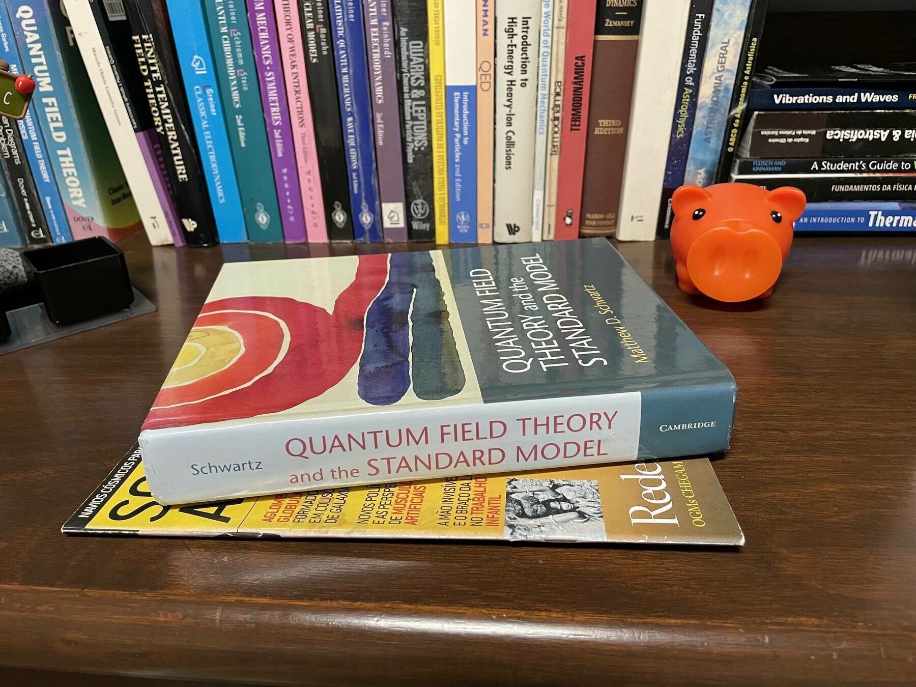 (a) Um livro está deitado em cima de uma revista sobre uma mesa.