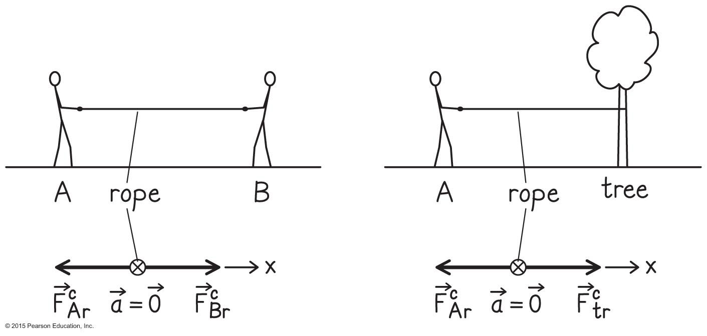 Fonte: https://images.app.goo.gl/Se duas pessoas, A e B, puxam as extremidades opostas de uma corda que está em repouso, cada uma exercendo uma força elástica horizontal de magnitude F, a tensão na corda é T = F. Suponha, em vez disso, que uma extremidade da corda esteja amarrada a uma árvore e A puxe a outra extremidade por ela mesmo com a mesma força de magnitude F. A tensão na corda é maior que, igual ou menor que a tensão quando A e B puxar extremidades opostas?