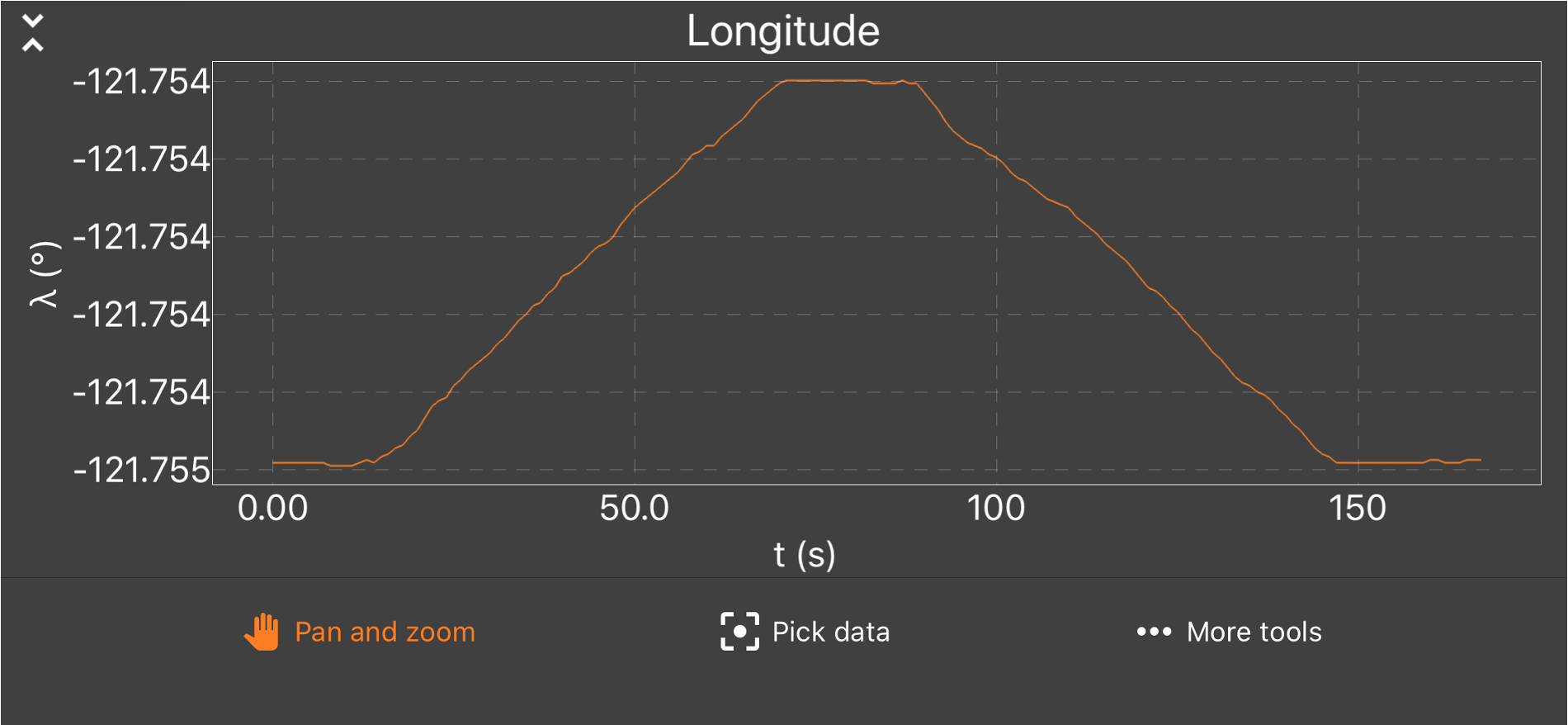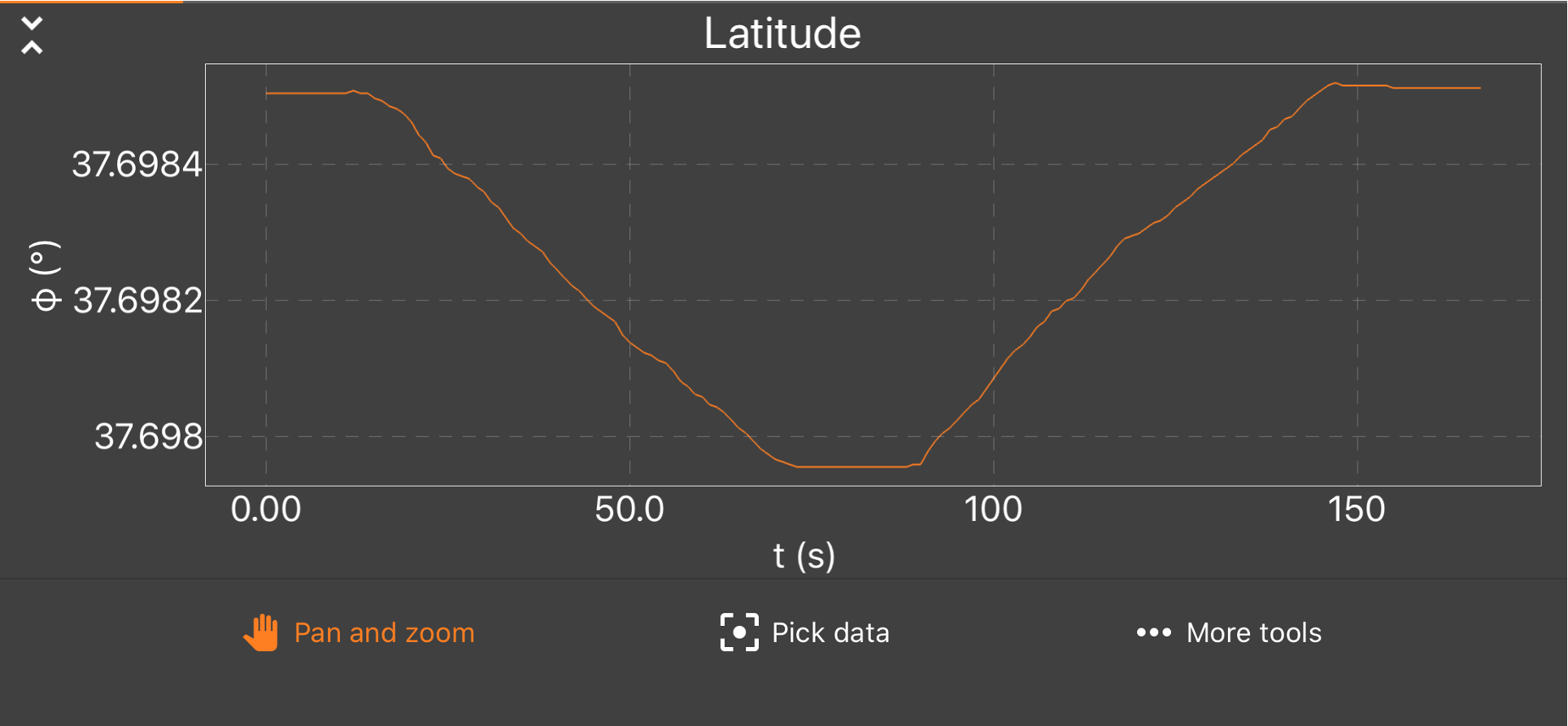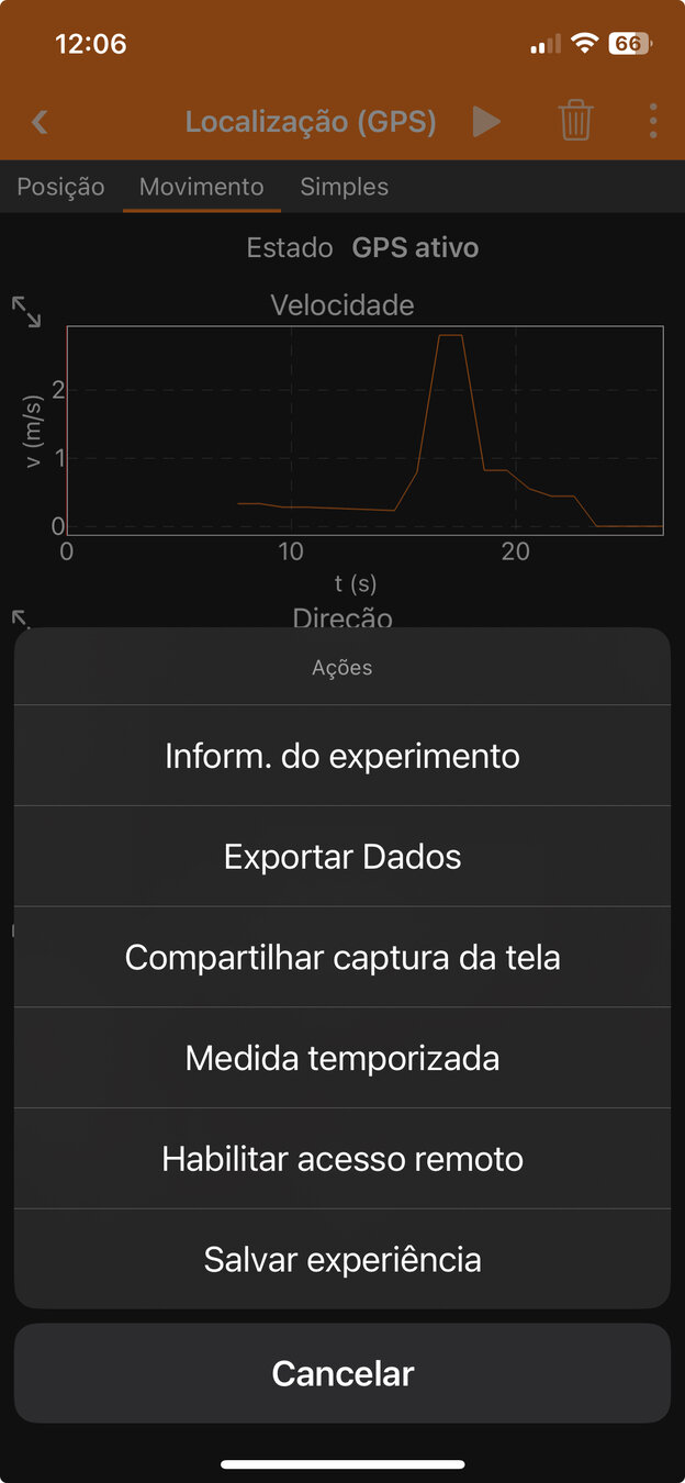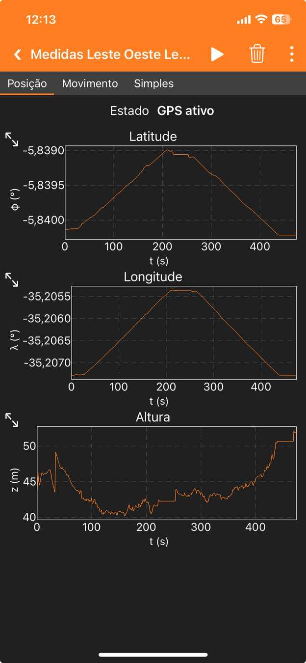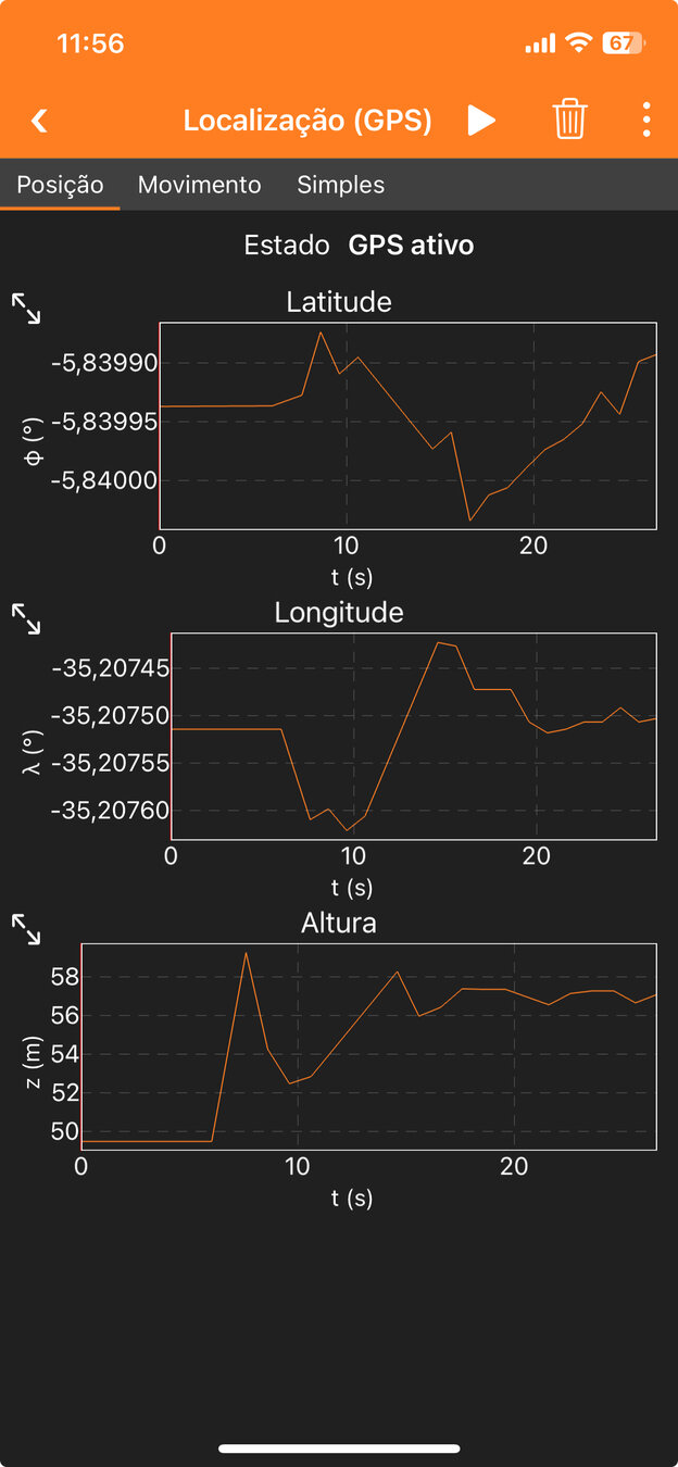 8. Capture a tela dos gráficos de latitude e longitude em relação ao tempo do aplicativo Phyphox. Exporte seus dados para um arquivo para uso posterior.