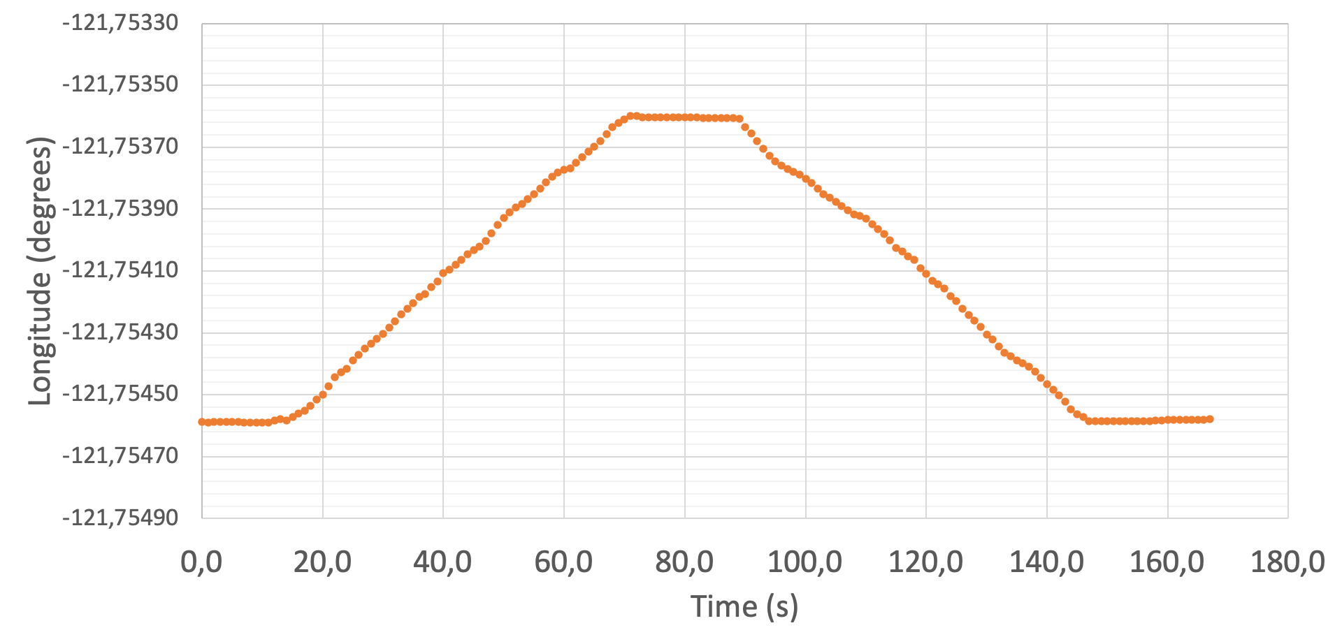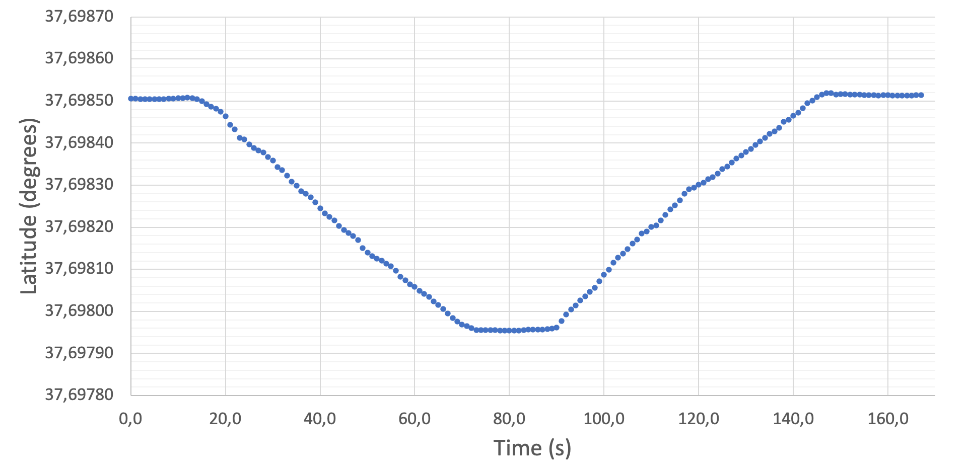 Gráficos de Latitude e Longitude em função do tempo de A para B.