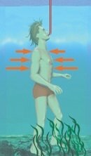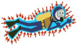 O que exerce força de contato sobre o mergulhador é uma fina camada de água que está à sua volta. Cada pequena porção desta camada exerce uma força em uma dada direção. O somatório das forças, entretanto, é vertical e para cima.
