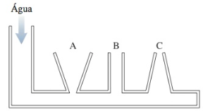 Fonte: RandallA água é lentamente derramada no recipiente da figura até que o nível tenha aumentado nos tubos A, B e C. A água não transborda em nenhum do tubos. Como se comparam entre si as profundidades de água nas três colunas?