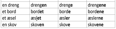 for eksempel: bilen (bestemt form), bilens (ejefald), biler (flertal).