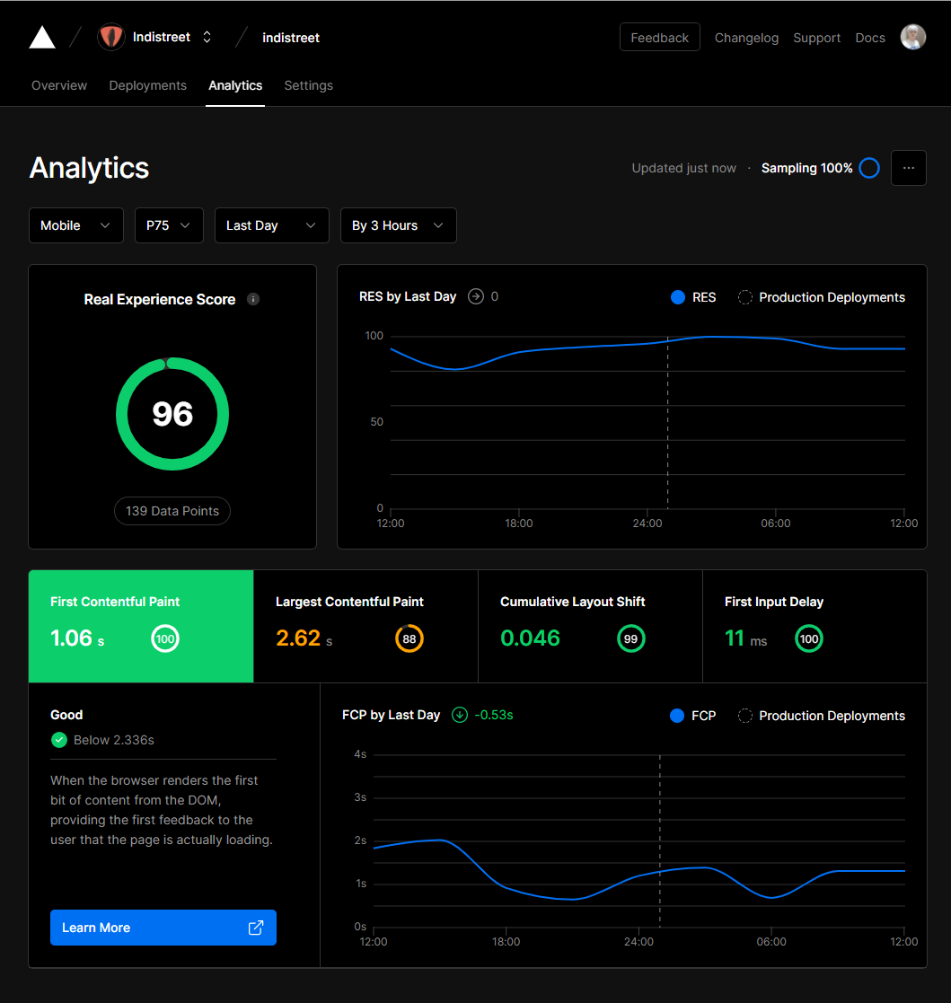 indistreet web을 개발하면서 사용된 기술, 특히 Jamstack에 대해 설명하는 슬라이드.