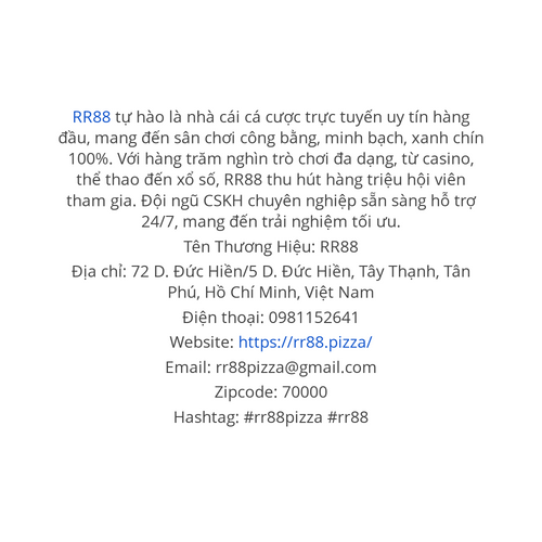 RR88 tự hào là nhà cái cá cược trực tuyến uy tín hàng đầu, mang đến sân chơi công bằng, minh bạch, xanh chín 100%. Với hàng trăm nghìn trò chơi đa dạng, từ casino, thể thao đến xổ số, RR88 thu hút hàng triệu hội viên tham gia. Đội ngũ CSKH chuyên nghiệp sẵn sàng hỗ trợ 24/7, mang đến trải nghiệm tối ưu. Tên Thương Hiệu: RR88 Địa chỉ: 72 D. Đức Hiền/5 D. Đức Hiền, Tây Thạnh, Tân Phú, Hồ Chí Minh, Việt Nam Điện thoại: 0981152641 Website: https://rr88.pizza/ Email: rr88pizza@gmail.com Zipcode: 70000 Hashtag: #rr88pizza #rr88