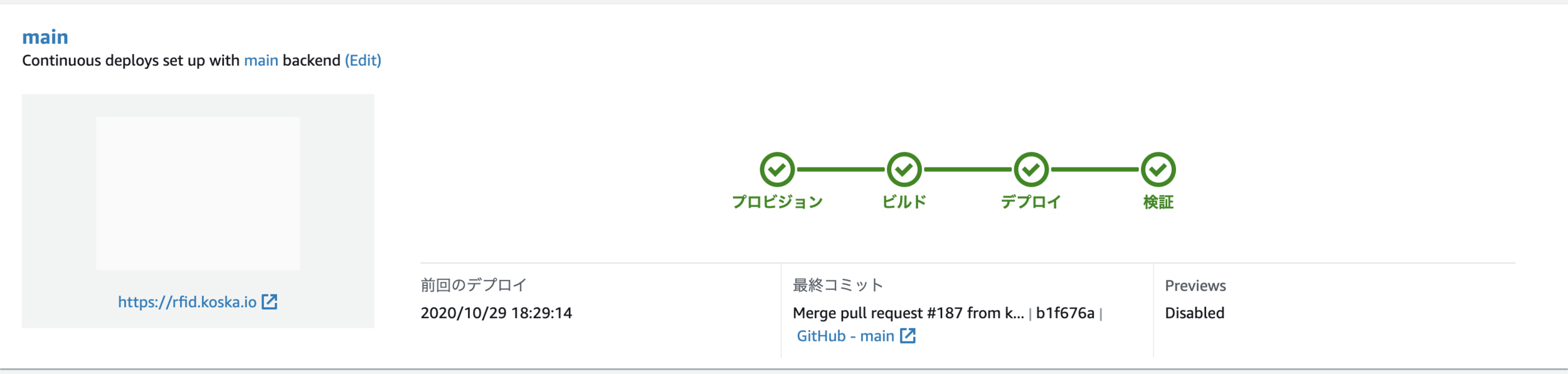 GitHUBのブランチとAmplify環境を紐づけることで、そのブランチに変更があった場合、自動でデプロイが行われる。