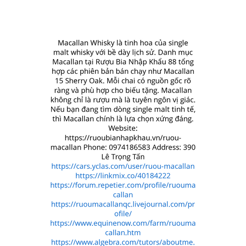 Website: https://ruoubianhapkhau.vn/ruou-macallan Macallan Whisky là tinh hoa của nghệ thuật chưng cất với di sản lâu đời. Bộ sưu tập Macallan chính hãng tại Rượu Bia Nhập Khẩu 88 gồm các phiên bản nổi bật như Macallan 18. Mỗi chai có nguồn gốc rõ rà