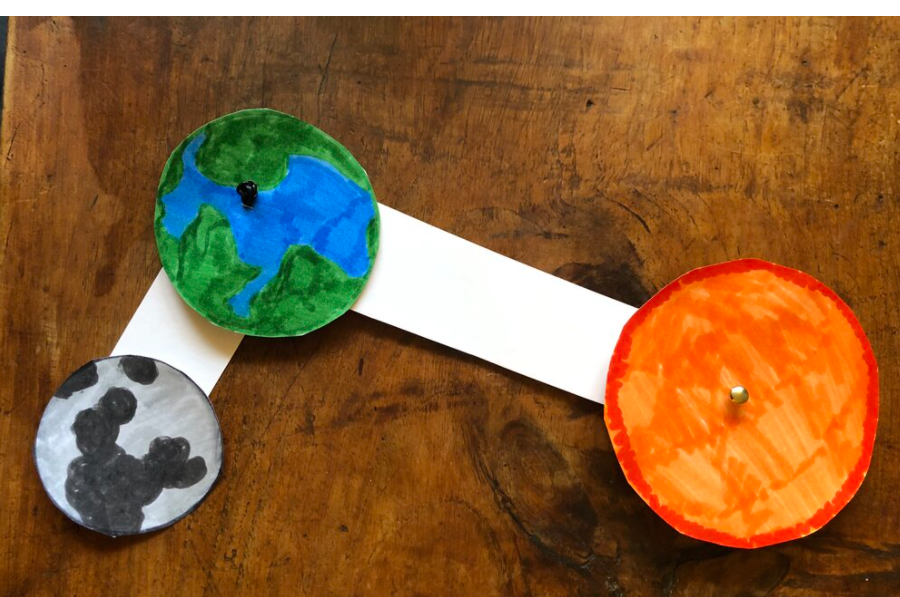 Using the second brad, poke a hole through your earth and the strip of paper with the moon attached to one end. Put the metal brad through both holes, bending the ends flat to secure the earth and the moon strip