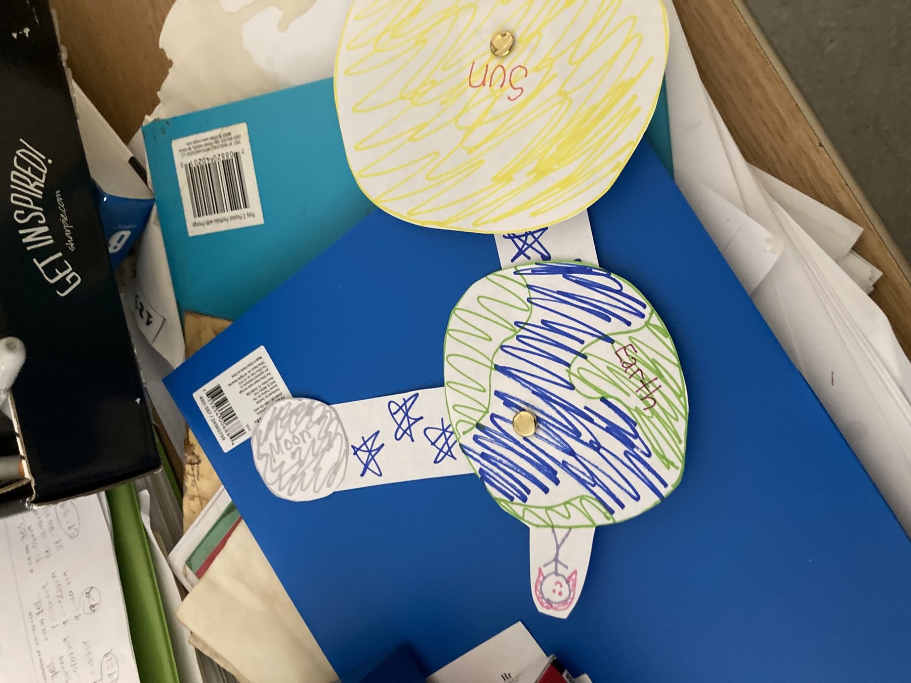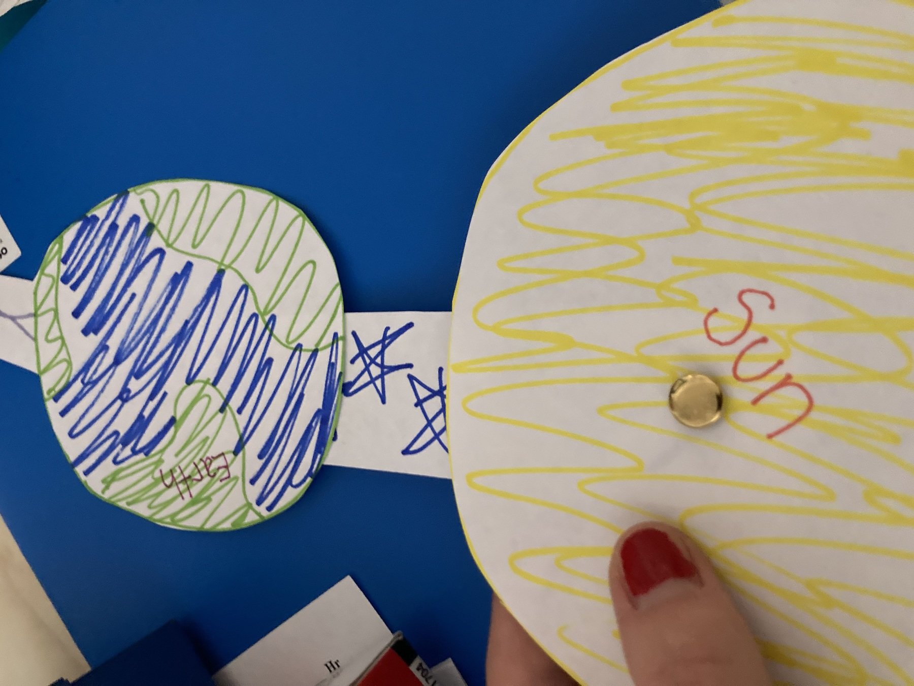 Poke a hole through your sun and the other end of your paper strip with Earth attached to the other end. Put the metal brad through both holes, bending the ends flat to secure the sun to the paper strip with earth