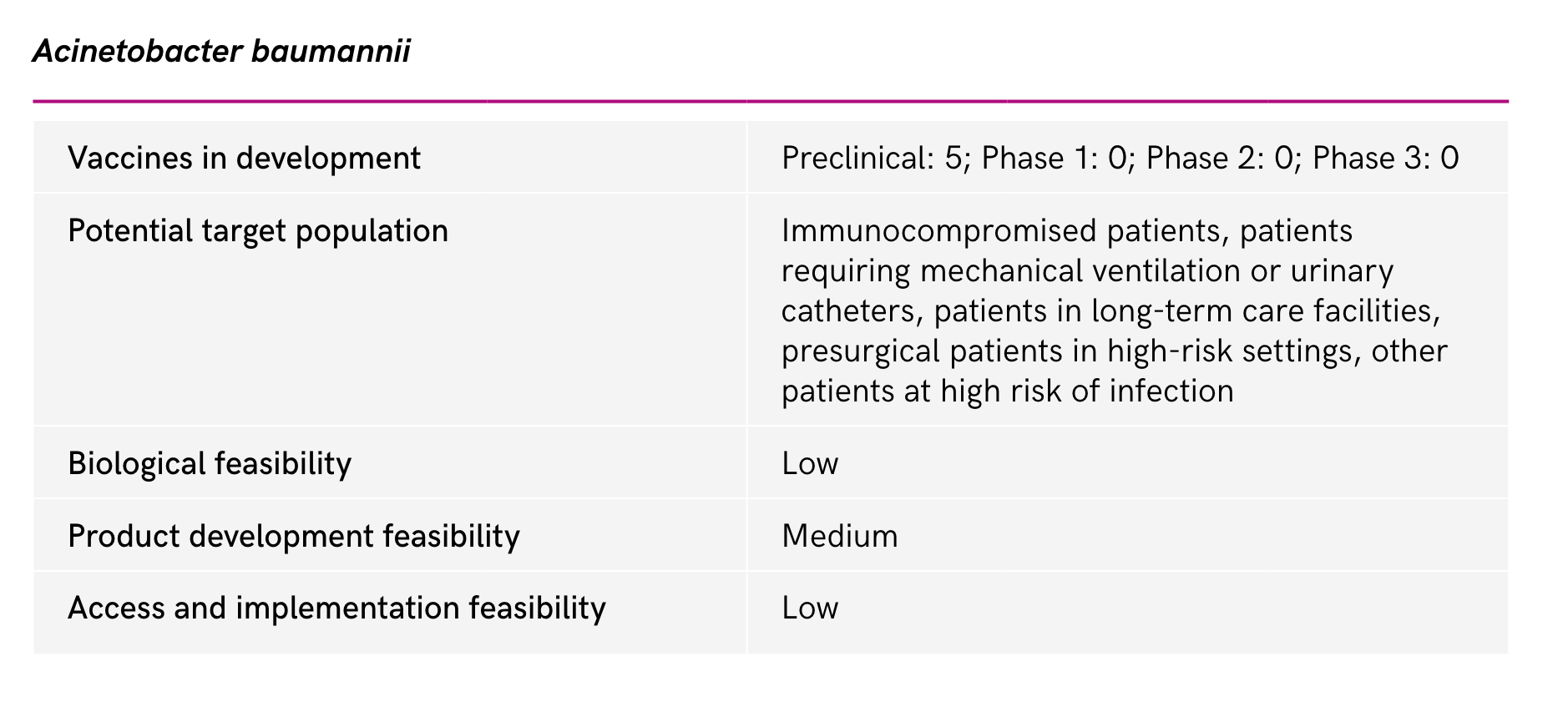 Pathogens on the WHO list in this category include M. tuberculosis (due to sub-optimal effectiveness of BCG vaccine), N. gonorrhoeae, P. aeruginosa, S. aureus and E. coli (urinary):
