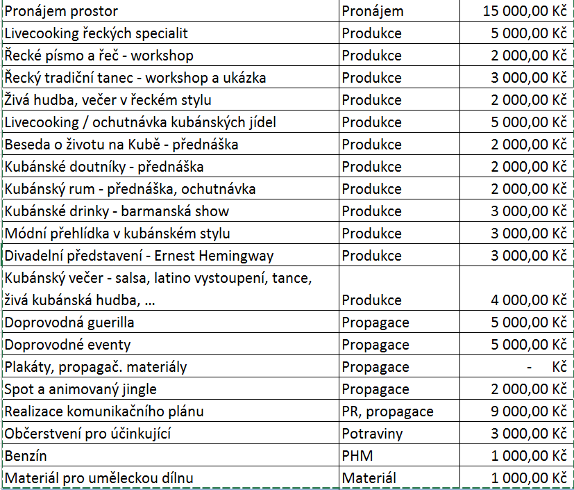 festivalové dění rozdělíme do min. 2 částí, přičemž jedna bude určitým způsobem zpoplatněná a bude zahrnovat "lepší" část programu (ochutnávky, divadlo, výuka tance apod.), druhá bude zdarma a bude zahrnovat vybrané přednášky, workshopy, diskuze atp.)