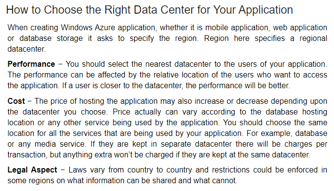 When we think of cloud, we imagine a place with large number of machines in big rooms. There must be a place where all the data is stored. Microsoft has datacenters all over the world from where Windows Azure services are managed. Datacenters are divided in regions. The exact location of these datacenters is not revealed by Microsoft for obvious security reasons.