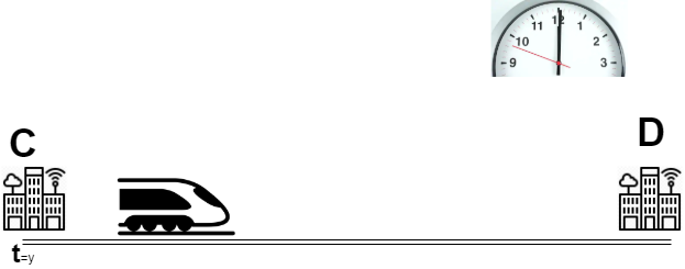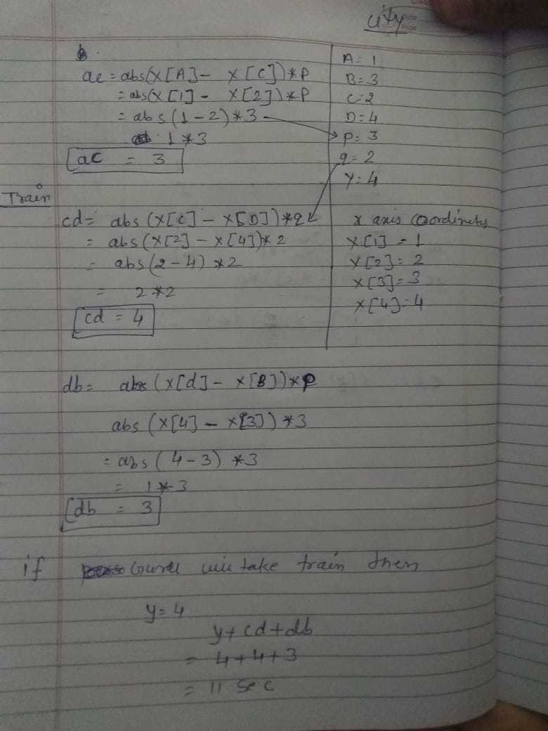 There is a train that travels from city C to city D which travels 1 metre in Q secs which starts at time t=Y secs. Guru can take the train only at city C and leave the train only at city D.