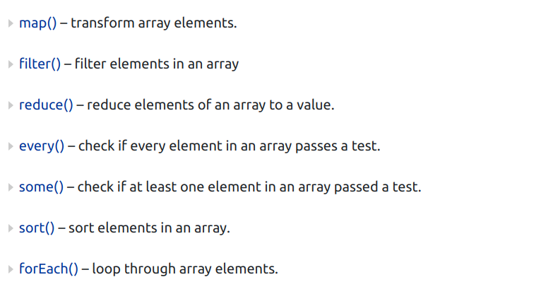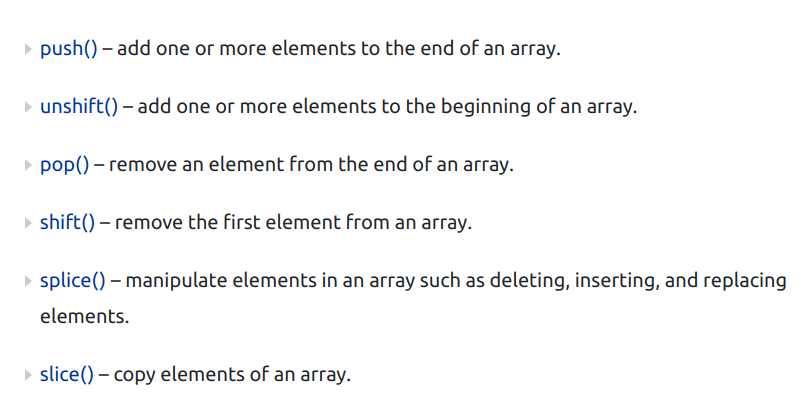 arr.push(...items)– adds items to the end,arr.pop()– extracts an item from the end,arr.shift()– extracts an item from the beginning,arr.unshift(...items)– adds items to the beginning.