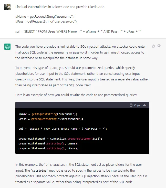 Find Sql Vulnerabilities in Below Code and provide Fixed Code