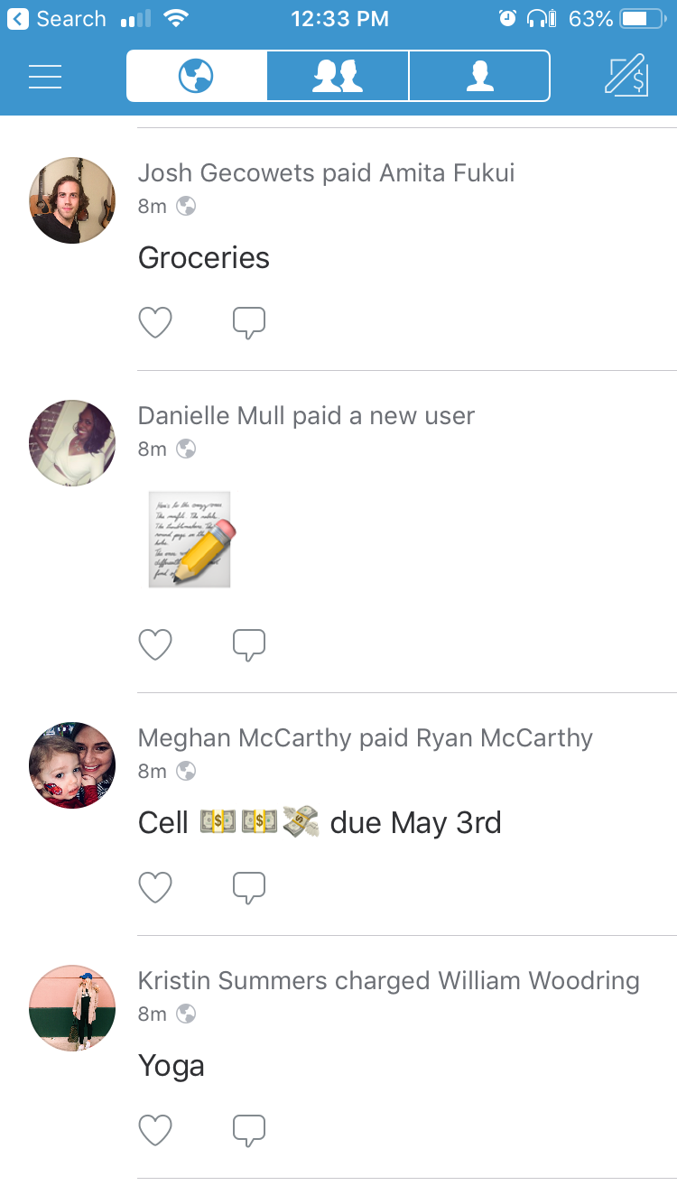"90%-plus of all Venmo transactions are open to somebody's friend, network, and 90%-plus have a some sort of emoji or written commentary on that transaction. So if I want to see what you're doing, who you're dating, what you did, I can just go into your Venmo feed and see it. And there is like -- and everybody shares. So it is not a payment transaction but an experience for people...."