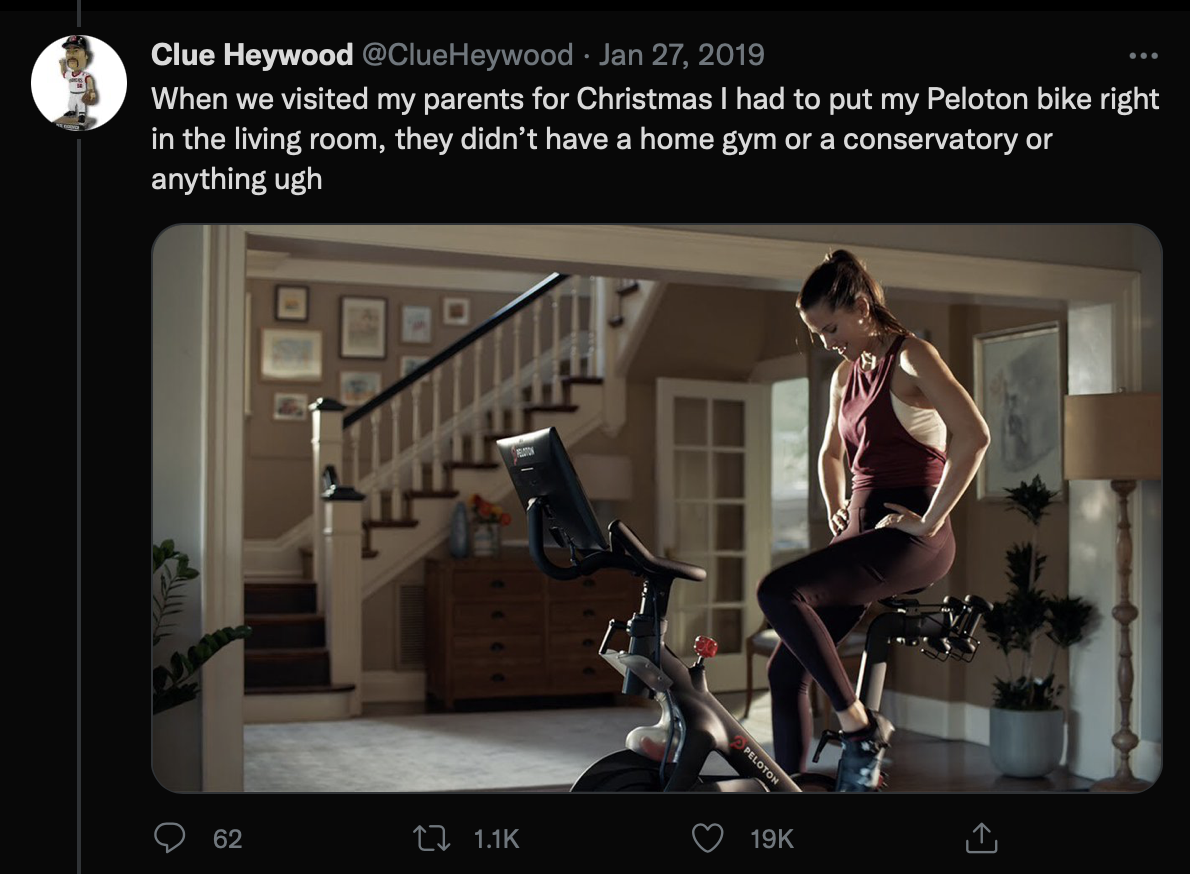 Most of Peloton's marketing focuses on a high-end experience. They show their bikes placed into huge, beautiful houses, ridden by attractive people with and impeccable sense of exercise fashion.