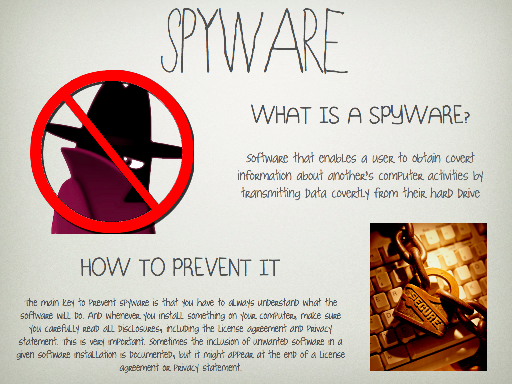 El spyware es un tipo de software malicioso el cual monitorea tu actividad o se encarga de robar información desde tu computador. Para este tipo de mal existen un gran número de herramientas anti-spyware las cuales se pueden descargar de internet.