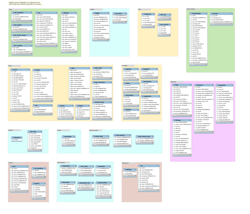 MediaWiki ha estado utilizando una base de datos back-end relacional ya que el software de la Fase II. El valor por defecto (y mejor apoyado por) DBMS para MediaWiki es MySQL, que es el que todos los sitios de Wikimedia utilizan, pero otros DBMS (como PostgreSQL, Oracle y SQLite) tienen implementaciones apoyados por la comunidad. Un administrador de sistemas puede elegir un DBMS durante la instalación de MediaWiki y MediaWiki proporciona tanto una abstracción de base de datos y una capa de abstracción de consulta que simplifican el acceso de base de datos para los desarrolladores.