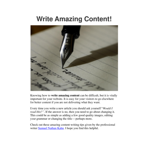 Knowing how to write amazing content can be difficult, but it is vitally important for your website. Check out amazing content writing tips given by the professional writer Samuel Nathan Kahn. I hope you find this helpful.