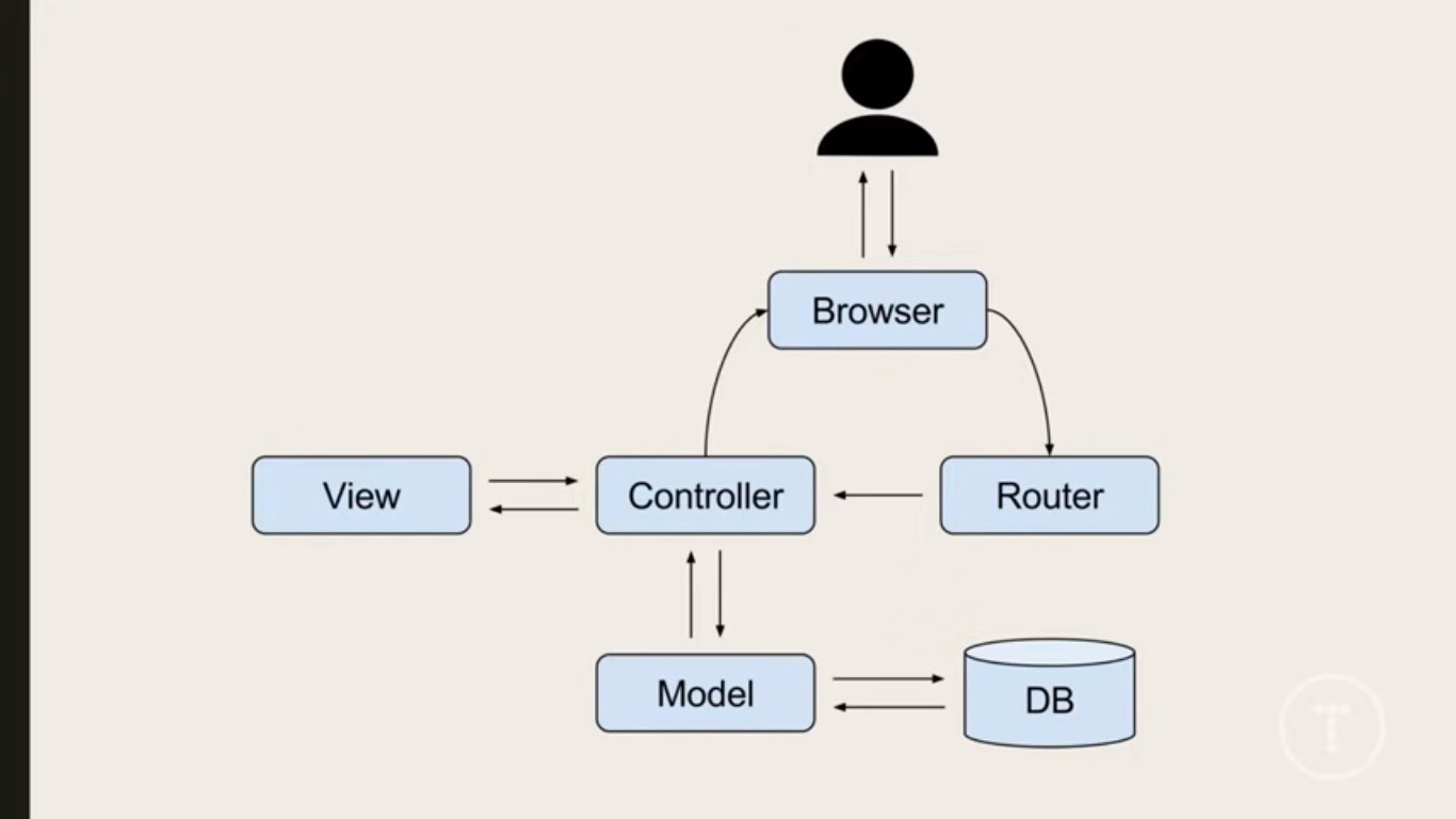 From the diagram in the previous slide we see that the user makes a request and the router hears that request and sends that request to the controller in charge of that request, the controller might need data from the database so it sends request to the model and the model responds with the data, then the controller finally loads everything (which may include the data gotten from the model) into the view, the view those its job and renders out HTML to the controller, the controller then sends the response to the user's browser.