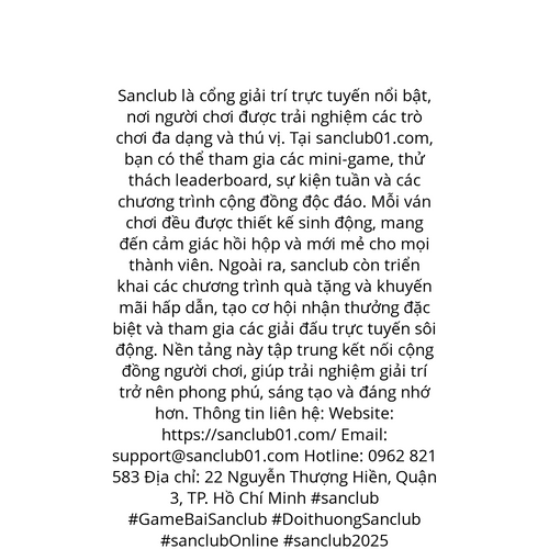 Website: https://sanclub01.com/. Sanclub là cổng giải trí trực tuyến nổi bật, nơi người chơi được trải nghiệm các trò chơi đa dạng và thú vị. Tại sanclub01.com, bạn có thể tham gia các mini-game, thử thách leaderboard, sự kiện tuần và các chương trìn