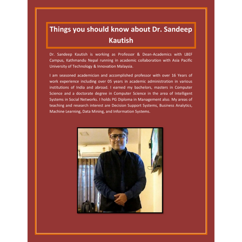 Dr. Sandeep Kautish is working as Professor & Dean-Academics with LBEF Campus, Kathmandu Nepal running in academic collaboration with Asia Pacific University of Technology & Innovation Malaysia.