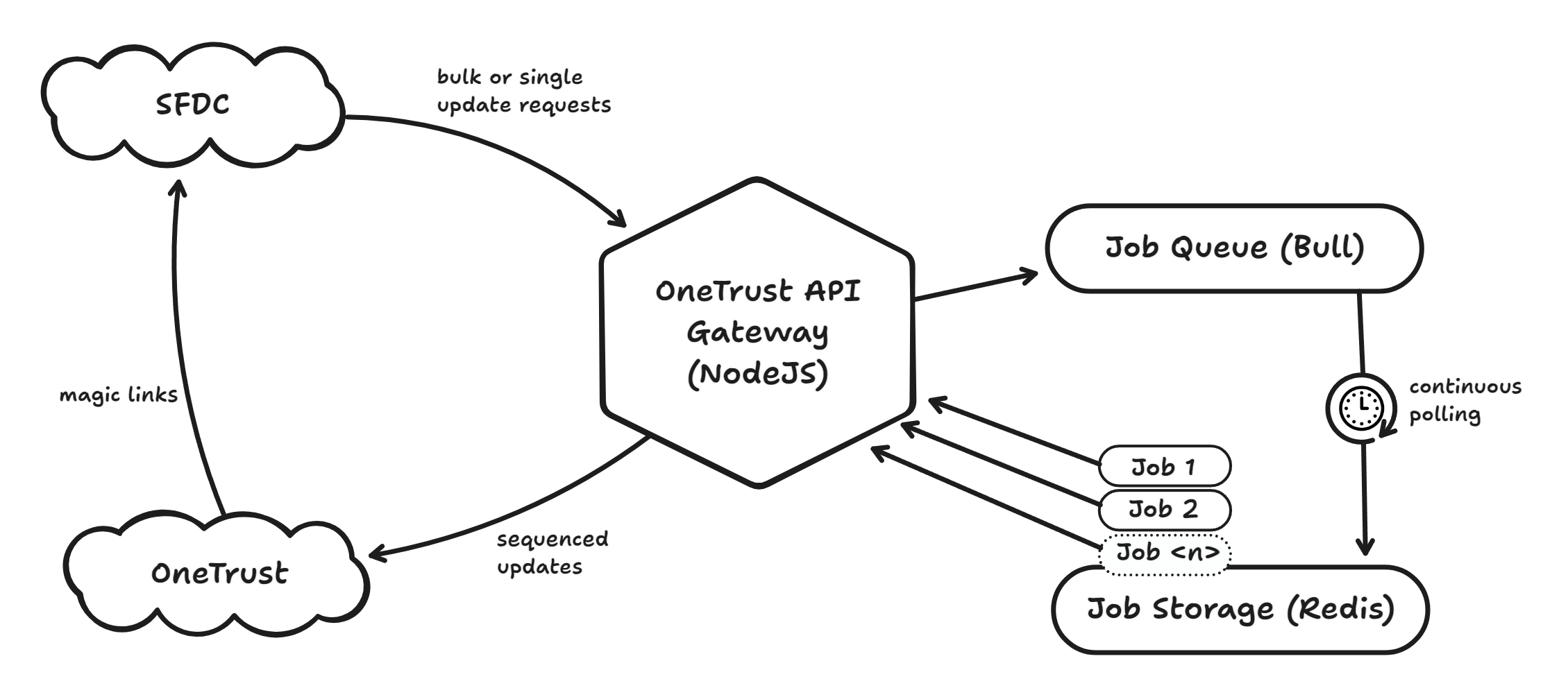 The API Gateway project completes the SFDC-OneTrust integration by ensuring SFDC-side updates are not lost due to OneTrust’s rate limits.