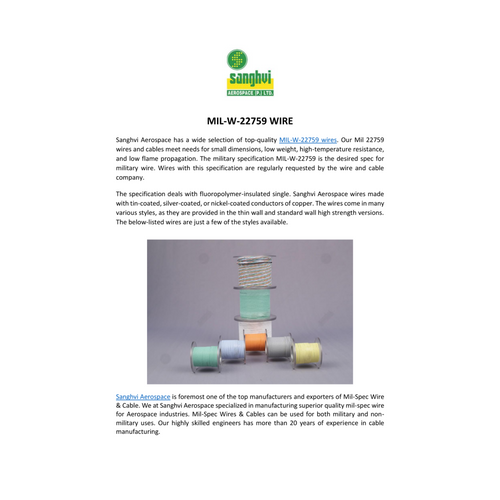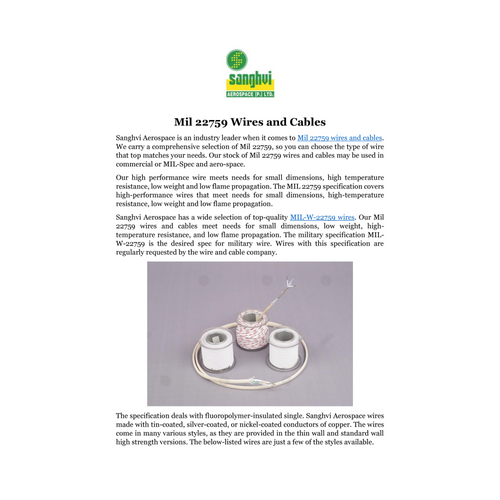 Sanghvi Aerospace has a wide selection of top-quality MIL-W-22759 wires. Our Mil 22759 wires and cables meet needs for small dimensions, low weight, high-temperature resistance, and low flame propagation. The military specification MIL-W-22759 is the desired spec for military wire. Visit at https://www.sanghviaerospace.com/polyimide-ptfe-hybrid-insulated-wire.html