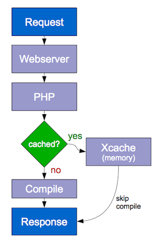 First time have request => PHP combiled source and store to cache, every request later PHP will using binary code from cache.