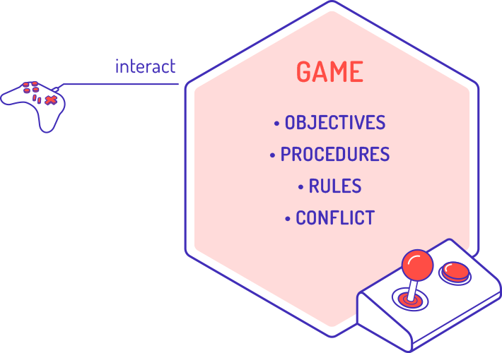 A rule-based formal system, with variable and quantifiable outcomes, where different outcomes are assigned different values, where the player exerts effort to influence the outcome,the player feels emotionally attached to the outcome, and the real-world consequences are optional and negotiable.
