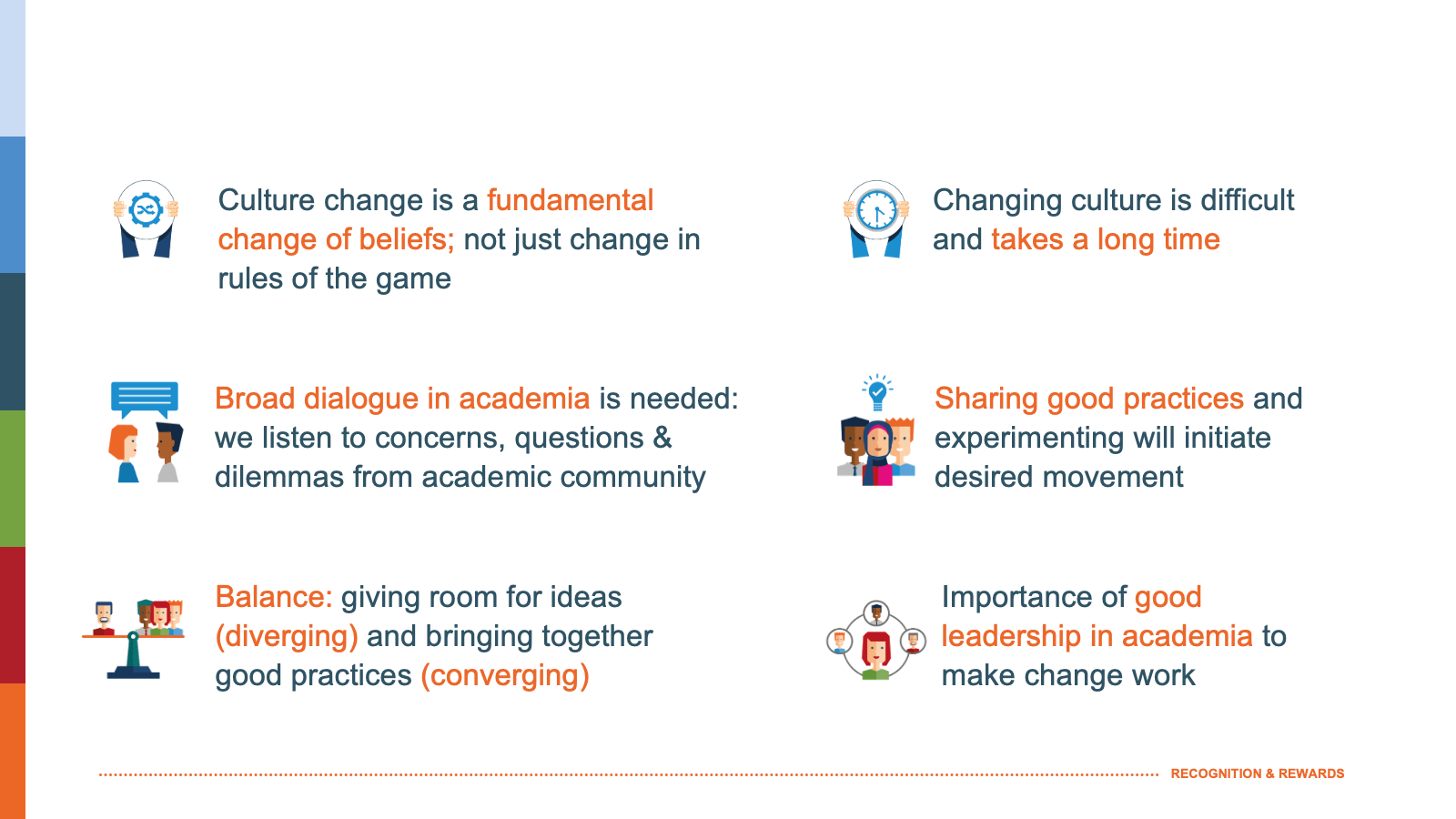 Current societal challenges demand for more cooperation and a multidisciplinary approach by scientists. Putting into practice the shared ambitions in Dutch academia requires a modernisation of the system of Recognition and Rewards. The modernisation should be designed to improve the quality of each of the key areas: education, research, impact, leadership and (for university medical centres) patient care. I will introduce the Dutch Recognition & Rewards programme in which we work in cooperation with all universities, university medical centers, reputable research institutes and research funders on a position paper: Room for everyone’s talent.