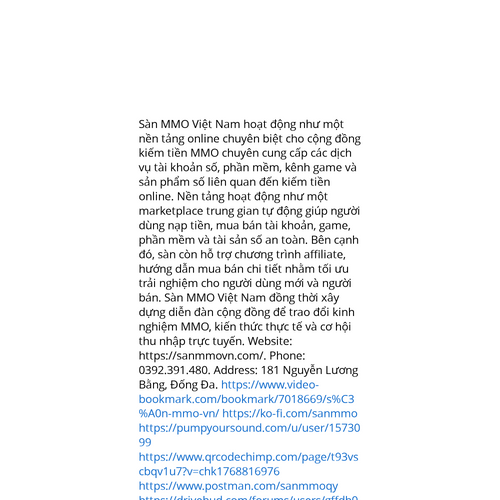 Website: https://sanmmovn.com/. Sàn MMO Việt Nam là nền tảng giao dịch trực tuyến dành cho cộng đồng MMO tại Việt Nam chuyên cung cấp các dịch vụ tài khoản số, phần mềm, kênh game và sản phẩm số liên quan đến kiếm tiền online. Trang web vận hành theo