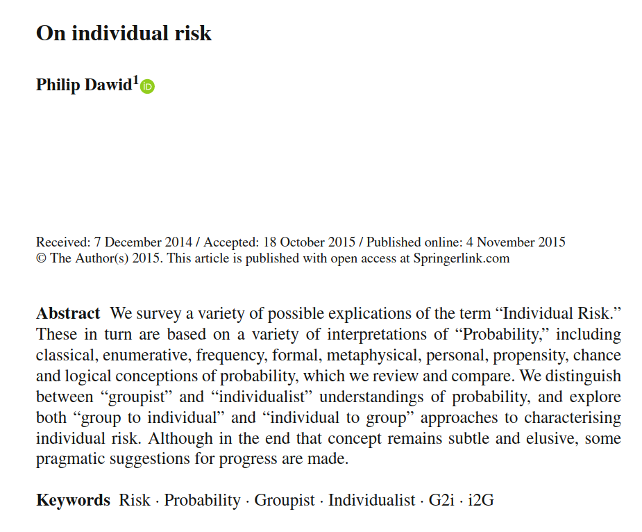 How much information about an individual to include? E.g. mortality risk by age, gender, location, occupation, health issues, etc... plagues both frequentist and personal probability interpretations