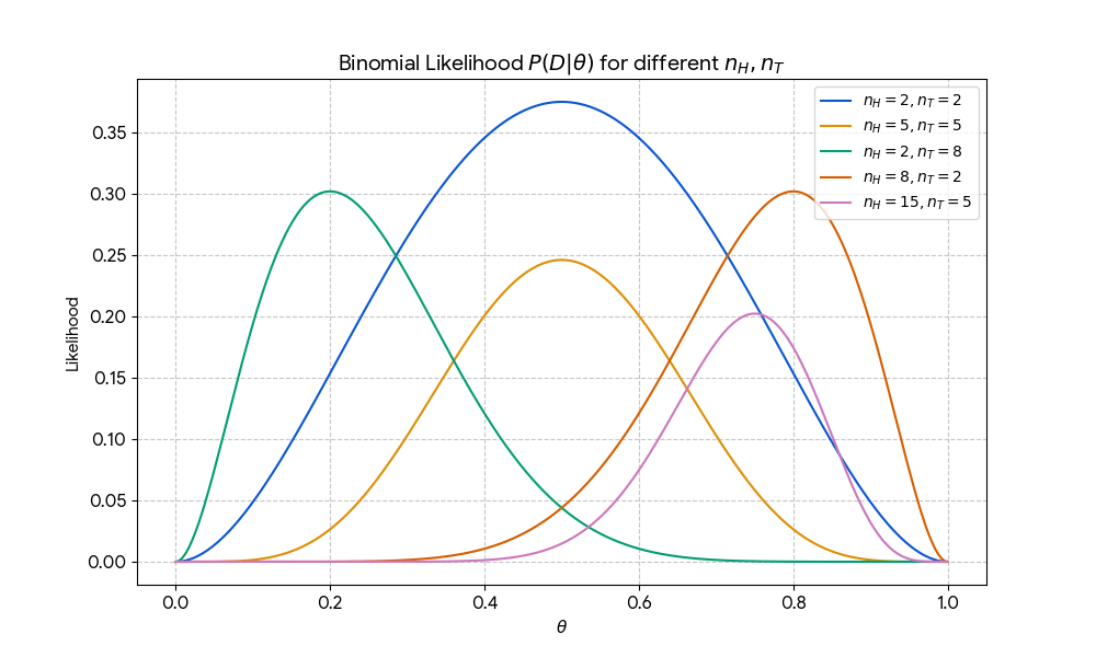 $$ P(D ; \theta) = \binom{n_H + n_T}{n_H} \theta^{n_H} (1-\theta)^{n_T} $$