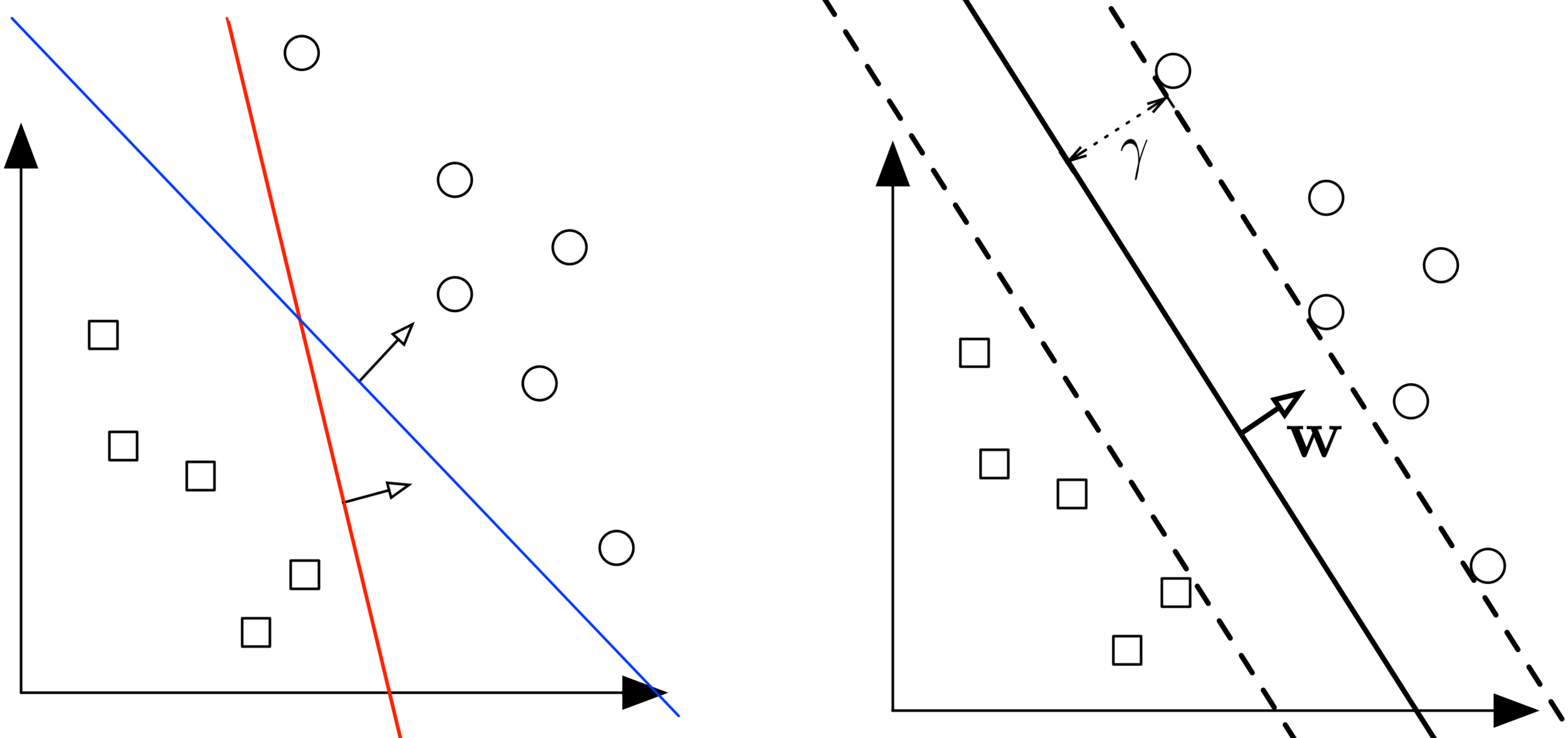 Margin: Minimum distance from data point \(\mathbf{x}\) to hyperplane \(\mathcal{H}\) $$ \gamma(\mathbf{w}, b) = \min_{\mathbf{x} \in D} \frac{|\mathbf{w}^\top\mathbf{x} + b|}{\|\mathbf{w}\|_2} $$