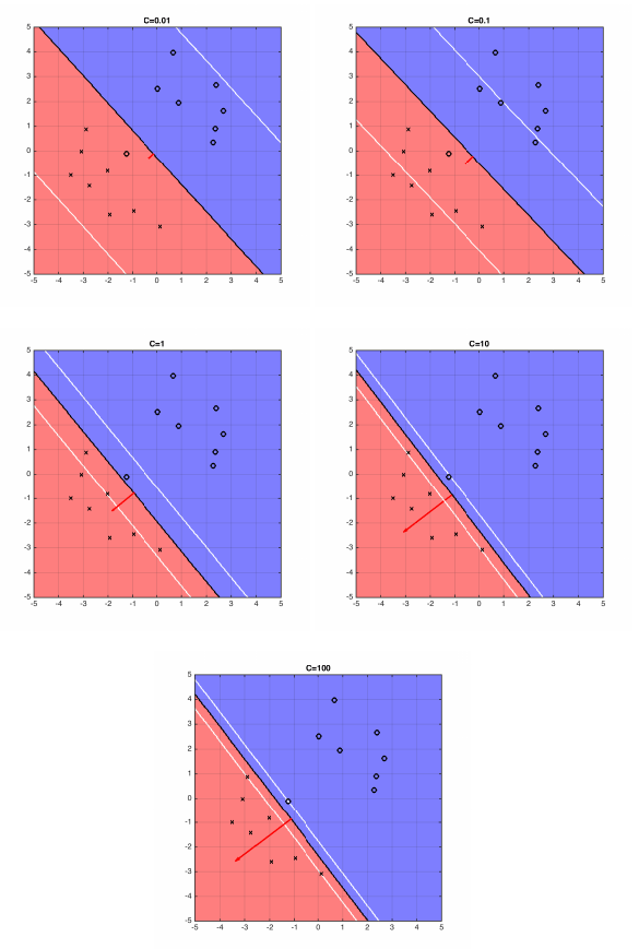 For larger values of \(C\), SVM becomes very strict and small violations heavily penalized. For smaller values, may "sacrifice" some points to obtain simpler solution (lower \(\|\mathbf{w}\|_2^2\)).