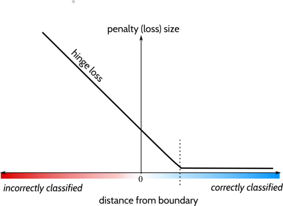 Hinge Loss Formulation: gives unconstrained version: $$ \min_{\mathbf{w}, b} \underbrace{\mathbf{w}^\top\mathbf{w}}_{\ell_2\text{-regularizer}} + C\sum_{i=1}^n \underbrace{\max[1 - y_i(\mathbf{w}^\top\mathbf{x}_i + b), 0]}_{\text{hinge-loss}} $$