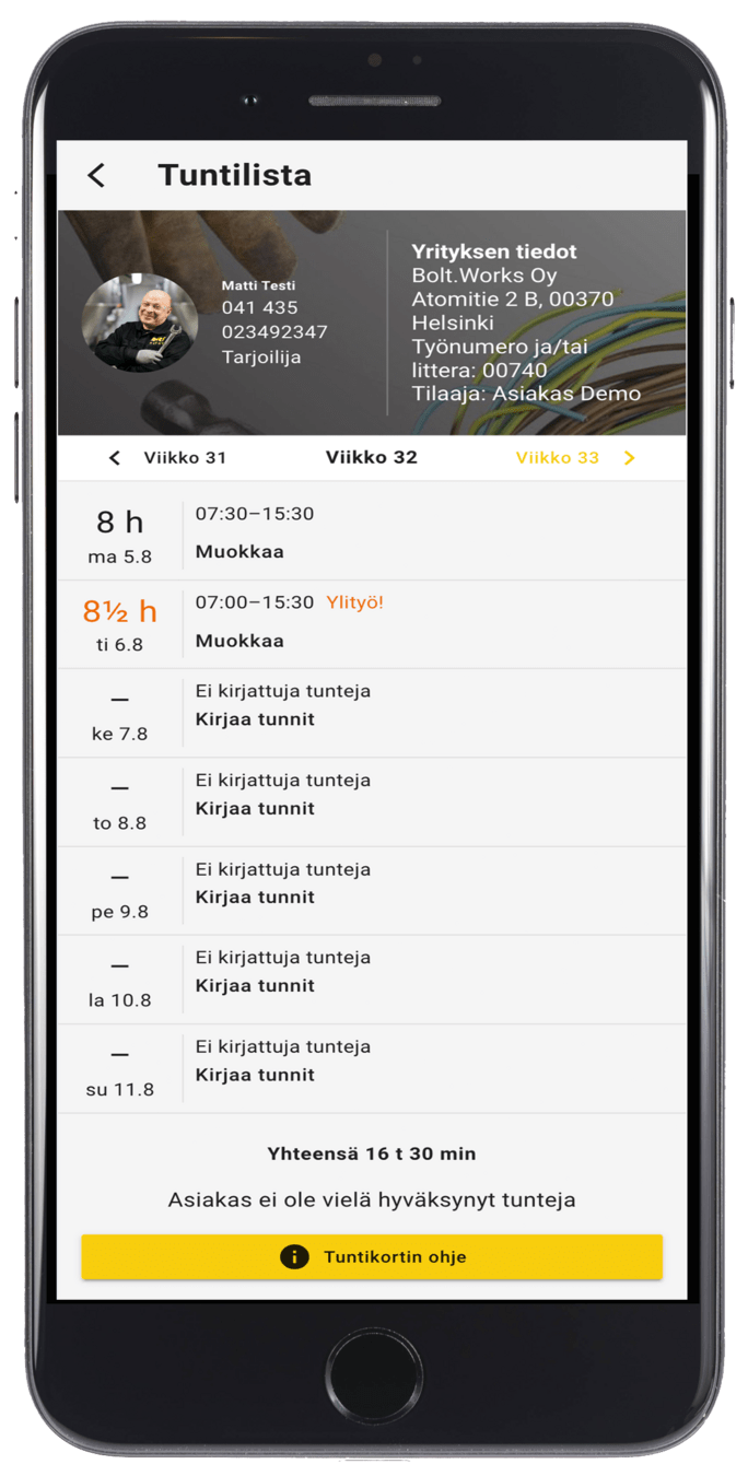 Mikäli teet poikkeavan pituisen työpäivän (esim. ylityöt), tulee asiasta sopia etukäteen työkohteen yhteyshenkilön sekä Boltin