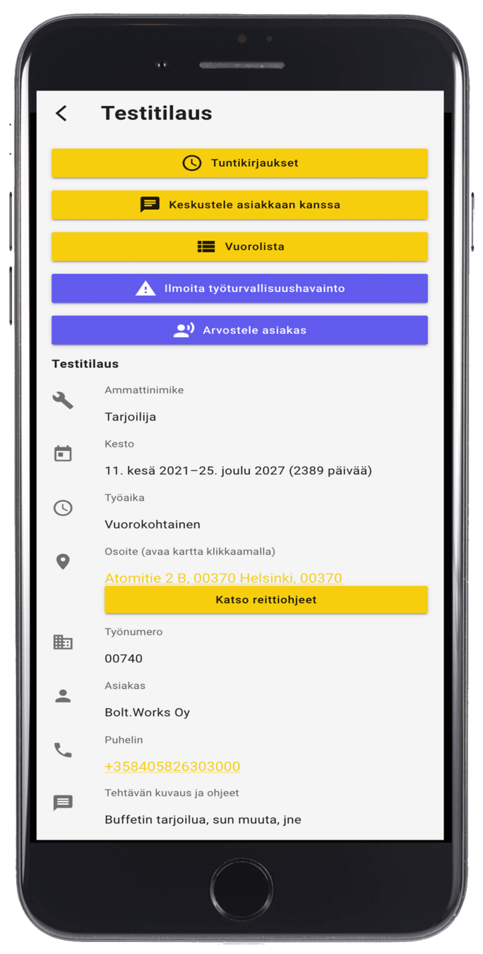 Bolt.Works-sovelluksesta löydät kaikki tiedot työtehtävääsi liittyen yhdestä paikasta. Näet sovelluksesta muun muassa työn keston, yhteyshenkilöt ja osoitteet. Voit tarkistaa työkohteen sijainnin sovelluksesta löytyvän kartan avulla ja navigoida perille. Sovelluksesta löydät chatin, joka on helpoin tapa olla yhteydessä omaan vastuurekrytoijaasi.