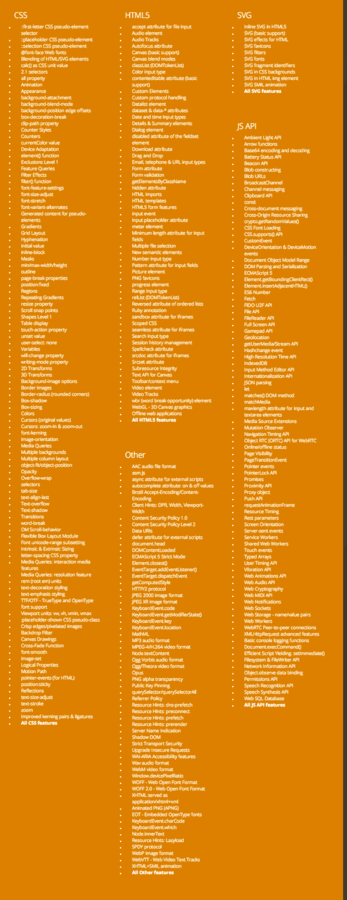 JavaScript (ES 6 / 7) which is renamed to ES2015 and ES2016, Babel, Closure, Clojure, React, Ember, Backbone, Oboe, Angular (1 & 2), Web Workers, Service Workers, RAIL, Rails, Hot Loading, Node.js & iojs, Promises, Observables, GraphQL, CSP & Channels, core.async, immutable, HTML5, npm, build tools, brunch, gulp, grunt, npm scripts, broccoli, ember-cli, mocha, chai, karma, sinon, jQuery, vanilla.js, Mithril, virtual doms, routing, isomorphic & universal code, Express, Koa, Elm, CLJS, PureScript, TypeScript, Flow, static type checking, compilers, compile-to-js languages, browserify, rollup, commonjs, amd, umd, SystemJS, js-to-native packages, Haskell, type systems, lambda calculus, functional programming, Meteor, transpilers, variadic behavior, context vs. contextless approaches, offline first, deployment tools, docker, macros, languages extensions, sweet.js, containers, container management services, dev-ops & web-ops, WebRTC, JSCS, style guides, linting, WebGL, Unity engine, benchmark suites, online coding environments…