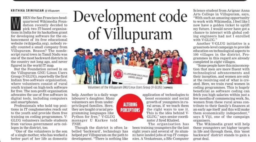 Viluppuram GNU/Linux Users Group (VGLUG) is a non profit organization started in 2013, Impression of worldwide Free and Open Source Software movement.