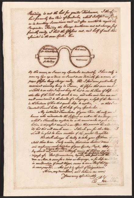Benjamin Franklin is credited with the invention of bifocal glasses, which he sketched here for his friend George Whatley, a London merchant and pamphleteer. Franklin told Whately he found them particularly useful at dinner in France, where he could see the food he was eating and watch the facial expressions of those seated at the table with him, which helped interpret the words being said. He wrote: "I understand French better by the help of my Spectacles."