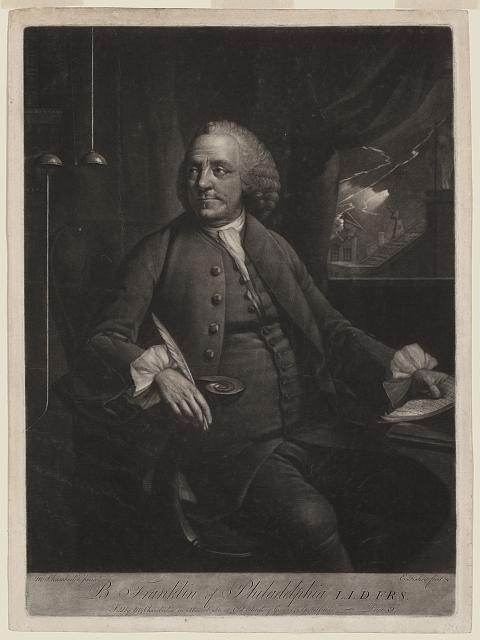 This portrait, which depicts Franklin as a learned scientist and inventor, was one of his favorites. Pictured on the left is the signal-bell apparatus Franklin devised to detect the presence of electrically-charged clouds. The bolt of lightning , seen through the open window, became an attribute closely identified with Franklin. At Franklin's death French philosopher/scientist Jacques Turgot wrote: "He seized the lightning from the sky and the scepter from the hand of tyrants."