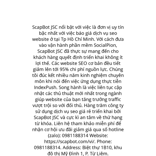 Website: https://scapbot.com/vi/. ScapBot JSC nổi bật với việc là đơn vị uy tín bậc nhất với việc báo giá dịch vụ seo website ở tại Tp Hồ Chí Minh. Với cách đưa vào vận hành phần mềm SocialPion, ScapBot JSC đã thực sự mang đến cho khách hàng quyết đ