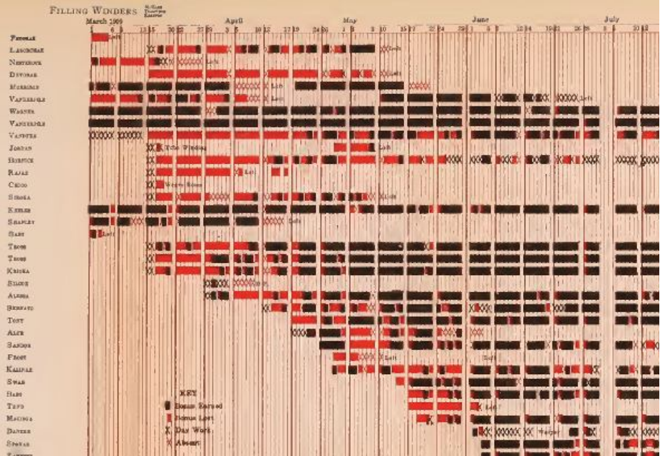 "A Gantt chart is a type of bar chart that illustrates a project schedule, named after its inventor, Henry Gantt (1861–1919) [...] Although widely used in project planning in the present day, Gantt charts were considered revolutionary when introduced. [...] One of the first major applications of Gantt charts was by the United States during World War I, at the instigation of General William Crozier"