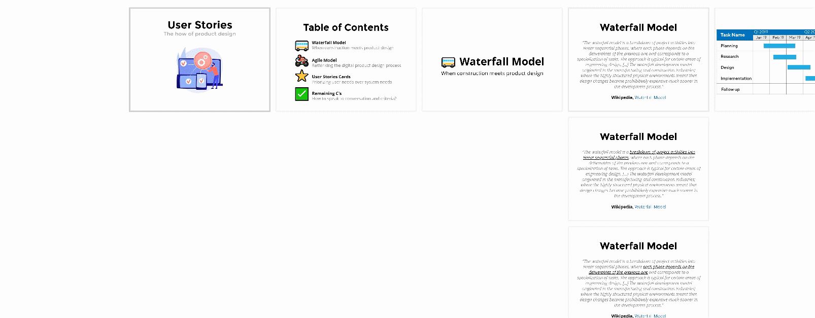 "The waterfall model is a breakdown of project activities into linear sequential phases, where each phase depends on the deliverables of the previous one and corresponds to a specialization of tasks. [...] The waterfall development model originated in the manufacturing and construction industries; where the highly structured physical environments meant that design changes became prohibitively expensive much sooner in the development process."