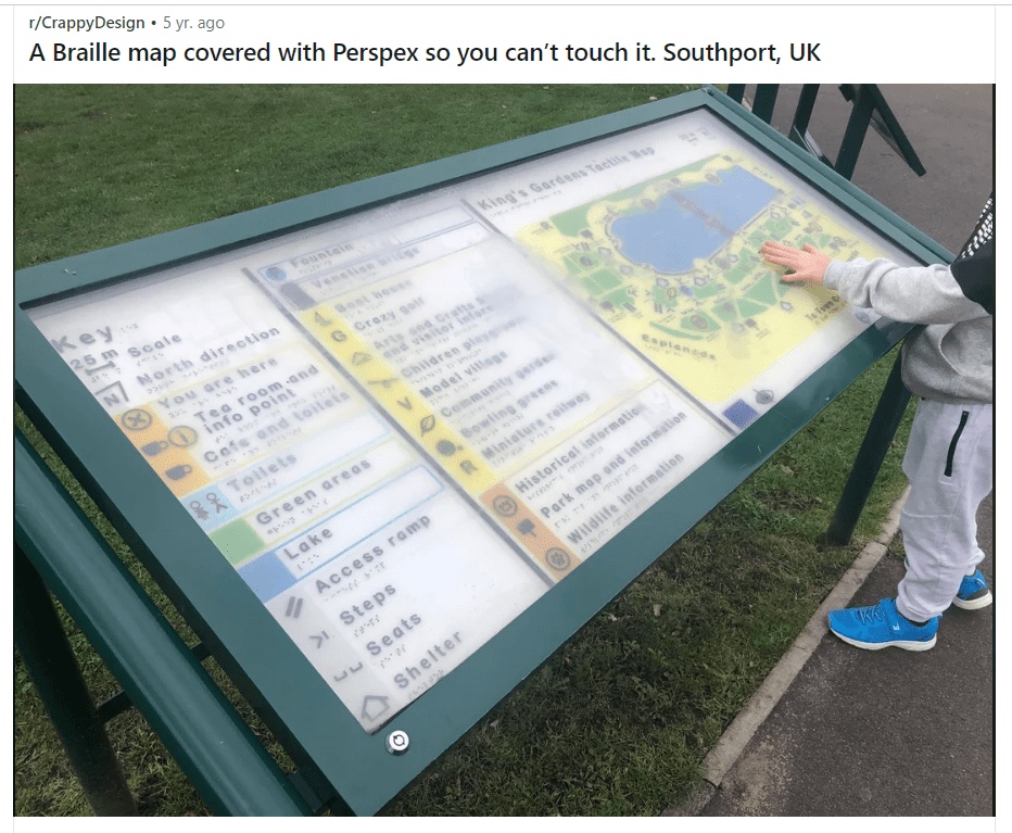 "accessibility is not approached as a last-minute checklist of additions that are piled onto the product, but rather a set of features that are designed in place from the start [...] In many cases, accessibility is often considered only at the end of the development process, typically during quality assurance or even after launch. Resolving accessibility issues on a finished product often yields unsatisfying solutions, for the designer and the user."