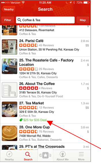 "This information is contextual and important to users who have specifically searched for a place to have tea. You may think that an alternative way of alerting users of potential [special] deals would be to send them a notification when such a deal has become available. Wrong! A notification sent irrespective of the current user goal would likely be ignored, and may even annoy users because it will disrupt their current task and be irrelevant to their current needs."